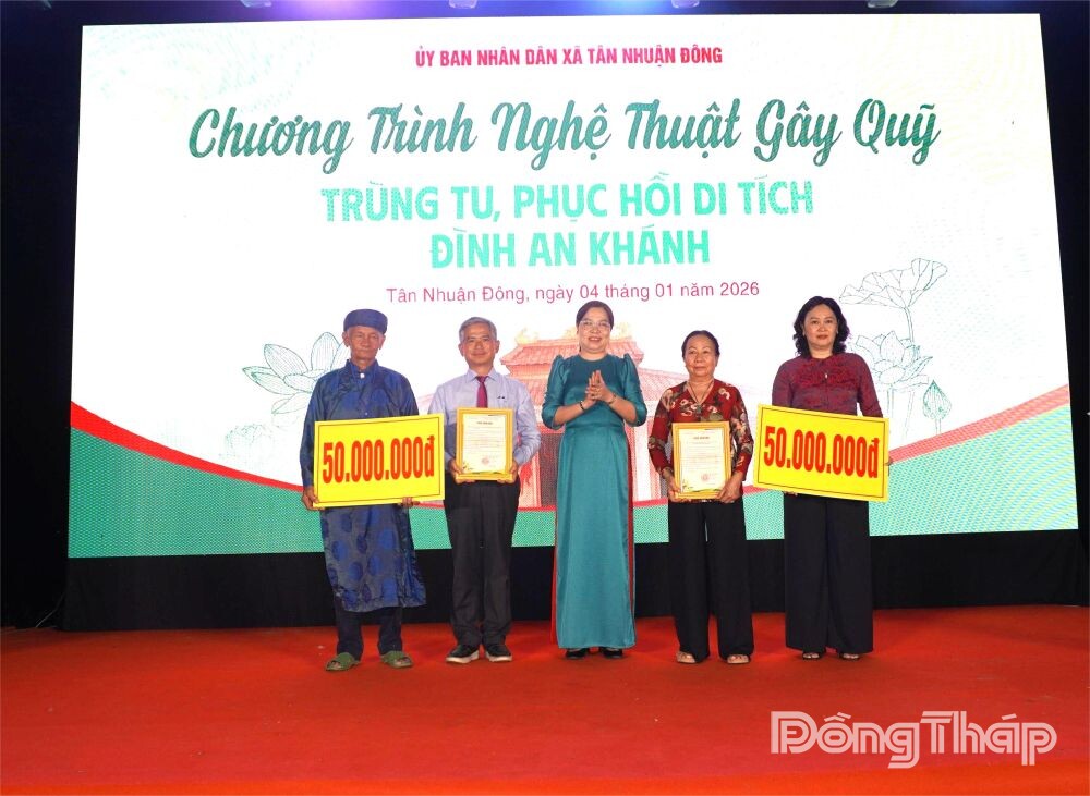Ngay sau phần Lễ đón nhận Bằng xếp hạng, Chương trình nghệ thuật gây quỹ trùng tu, phục hồi Di tích Đình An Khánh diễn ra sôi nổi với nhiều tiết mục đặc sắc ca ngợi quê hương, đất nước, mừng Đảng - mừng Xuân, ca ngợi vùng đất và con người xã Tân Nhuận Đông. Thông qua chương trình, Ban Vận động tiếp nhận sự đóng góp, ủng hộ của các cơ quan, đơn vị, doanh nghiệp, tổ chức, cá nhân trong và ngoài xã với tổng số tiền 274,65 triệu đồng.