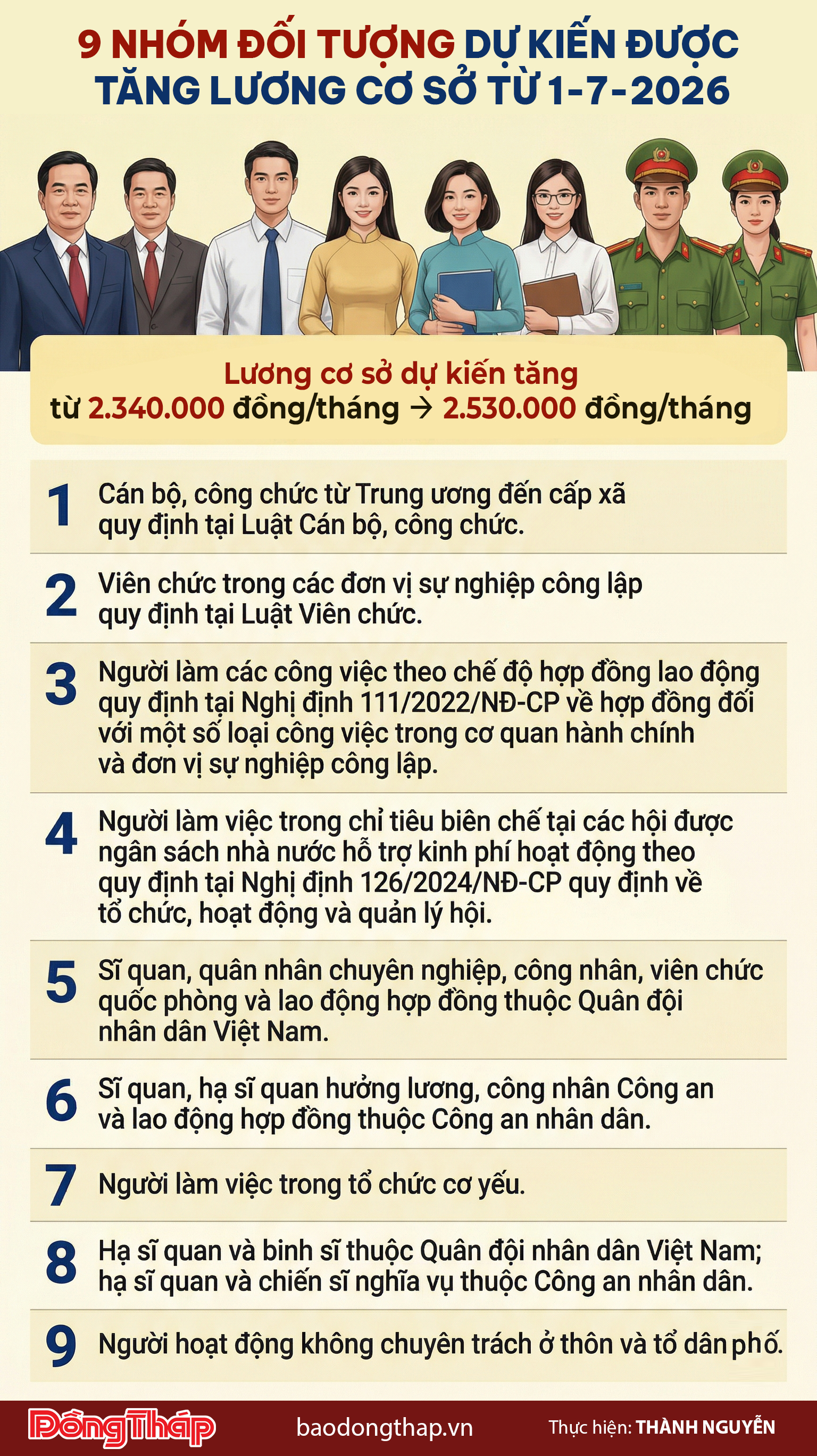 [Infographic] 9 nhóm đối tượng dự kiến được tăng lương cơ sở từ 1-7-2026Thứ Sáu, 27/03/2026, 10:25 (GMT+7)Theo dõi Báo Đồng Tháp trên Từ khóa: tăng lương cơ sởđối tượng tăng lươnglương cơ sở 2026nhóm đối tượngdự kiến tăng lương Bình luận 🔄 Gửi