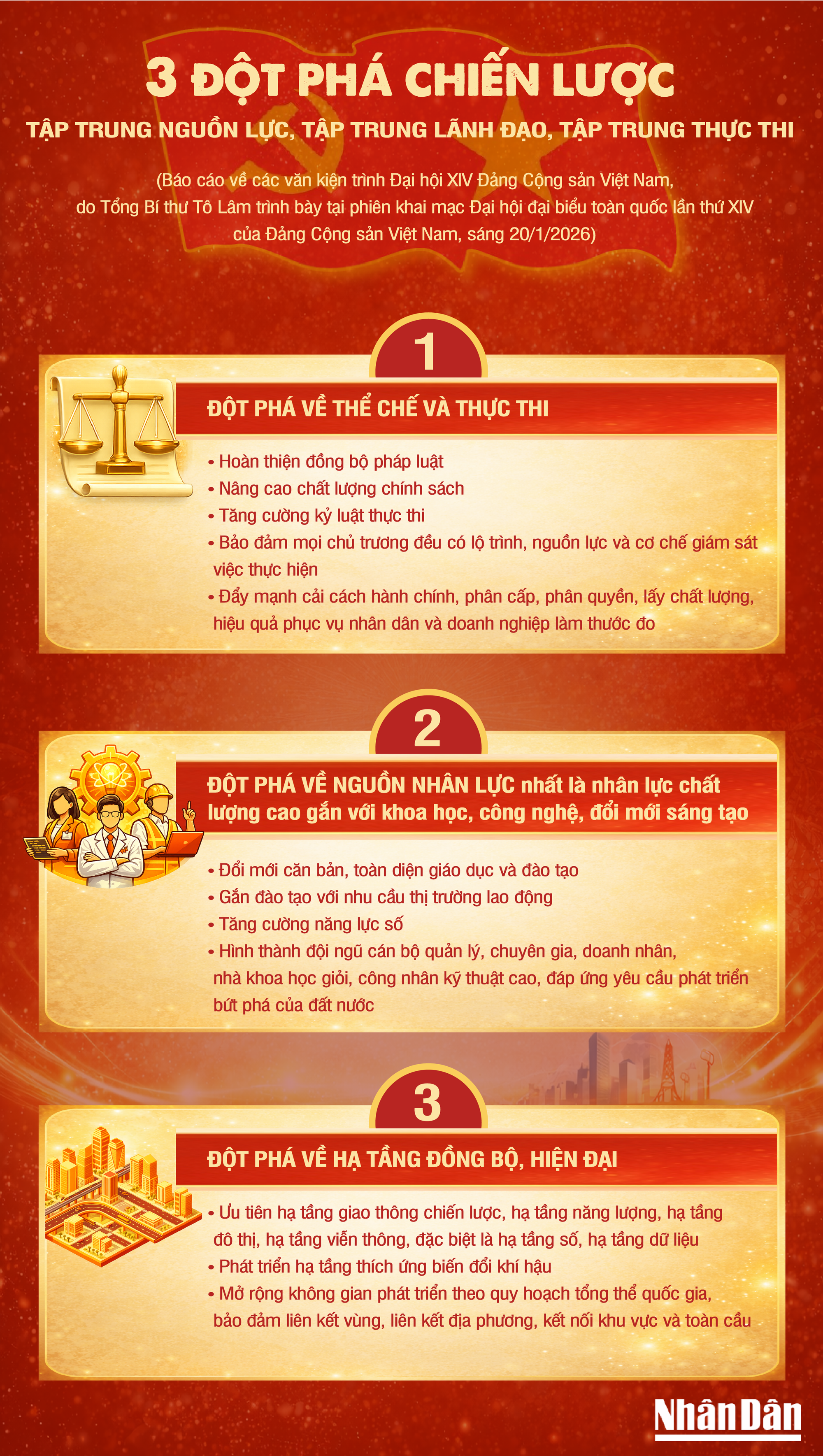 Ba đột phá chiến lược để thực hiện mục tiêu phát triển đất nước trong giai đoạn tới được thể hiện trong Báo cáo về các văn kiện trình Đại hội XIV Đảng Cộng sản Việt Nam, do Tổng Bí thư Tô Lâm trình bày tại phiên khai mạc Đại hội đại biểu toàn quốc lần thứ XIV của Đảng Cộng sản Việt Nam, diễn ra sáng 20-1-2026.