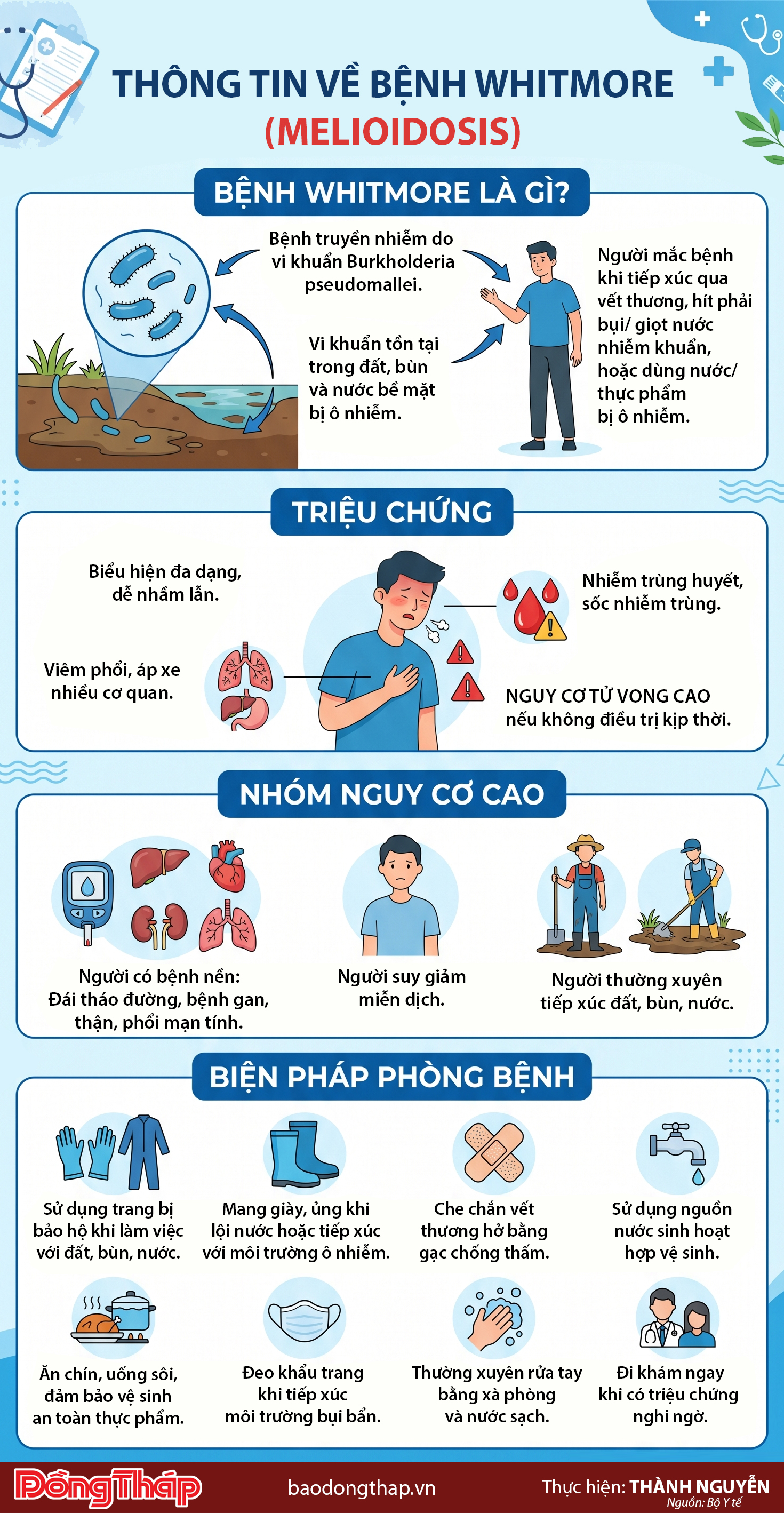 [Infographic] Thông tin về bệnh Whitmore (Melioidosis)Thứ Năm, 23/04/2026, 08:51 (GMT+7)Theo dõi Báo Đồng Tháp trên Từ khóa: bệnh Whitmore nguy hiểmvi khuẩn Burkholderia pseudomalleiđất bùn ô nhiễmlây nhiễm Whitmoretriệu chứng Whitmore Bình luận 🔄 Gửi