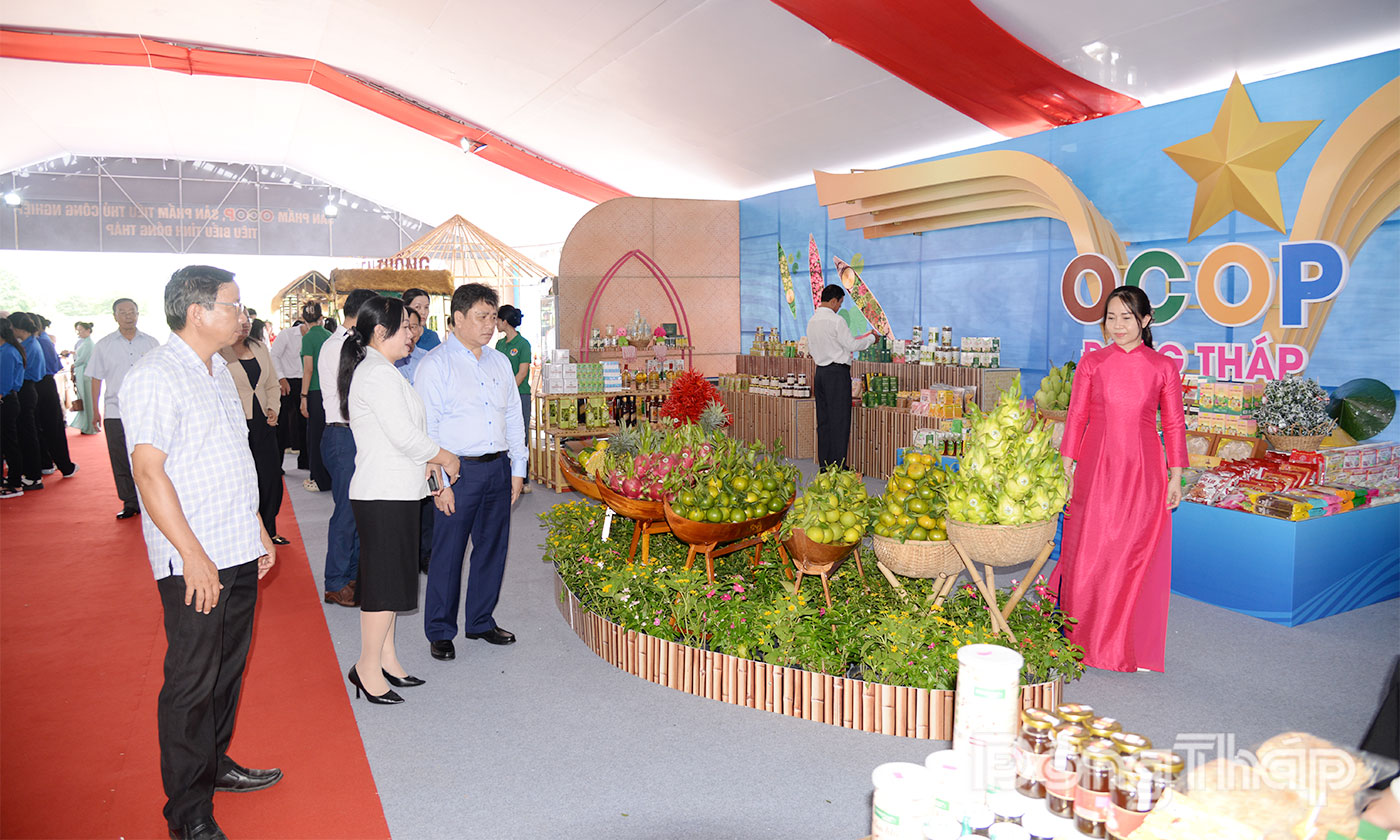 Lãnh đạo tỉnh tham quan khu vực trưng bày sản phẩm OCOP của tỉnh. |