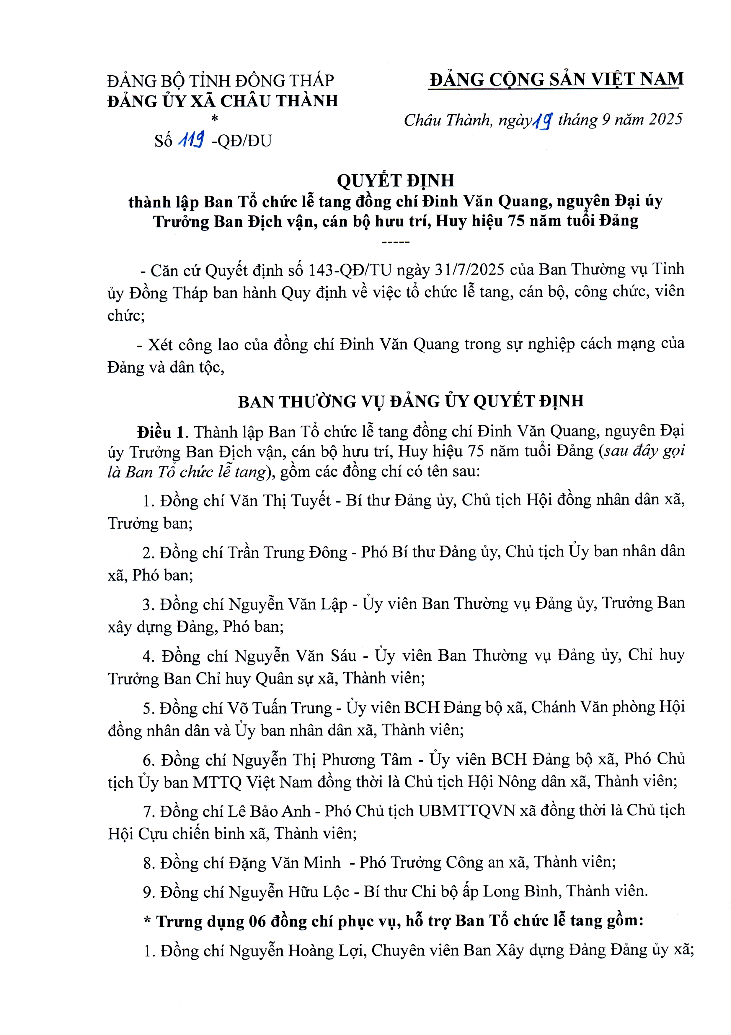 (ĐTO) Tỉnh ủy - Hội đồng nhân dân - Ủy ban nhân dân - Ủy ban Mặt trận Tổ quốc Việt Nam tỉnh Đồng Tháp và Đảng ủy - Hội đồng nhân dân - Ủy ban nhân dân - Ủy ban Mặt trận Tổ quốc Việt Nam xã Châu Thành cùng gia đình trân trọng thông báo: