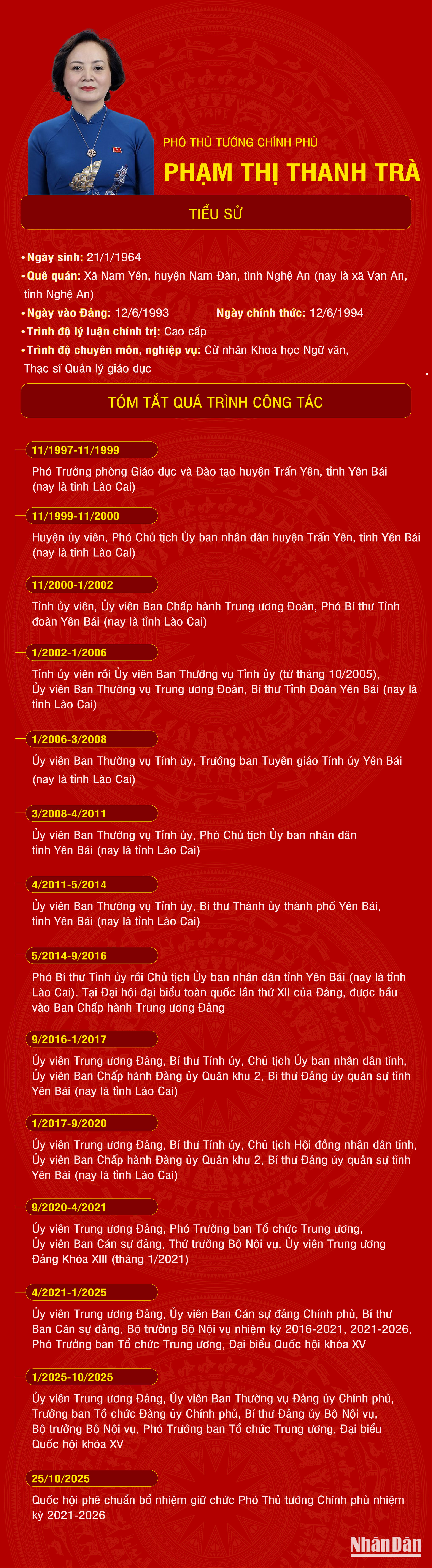 Ngày 25-10-2025, Quốc hội phê chuẩn bổ nhiệm bà Phạm Thị Thanh Trà giữ chức Phó Thủ tướng Chính phủ nhiệm kỳ 2021-2026.