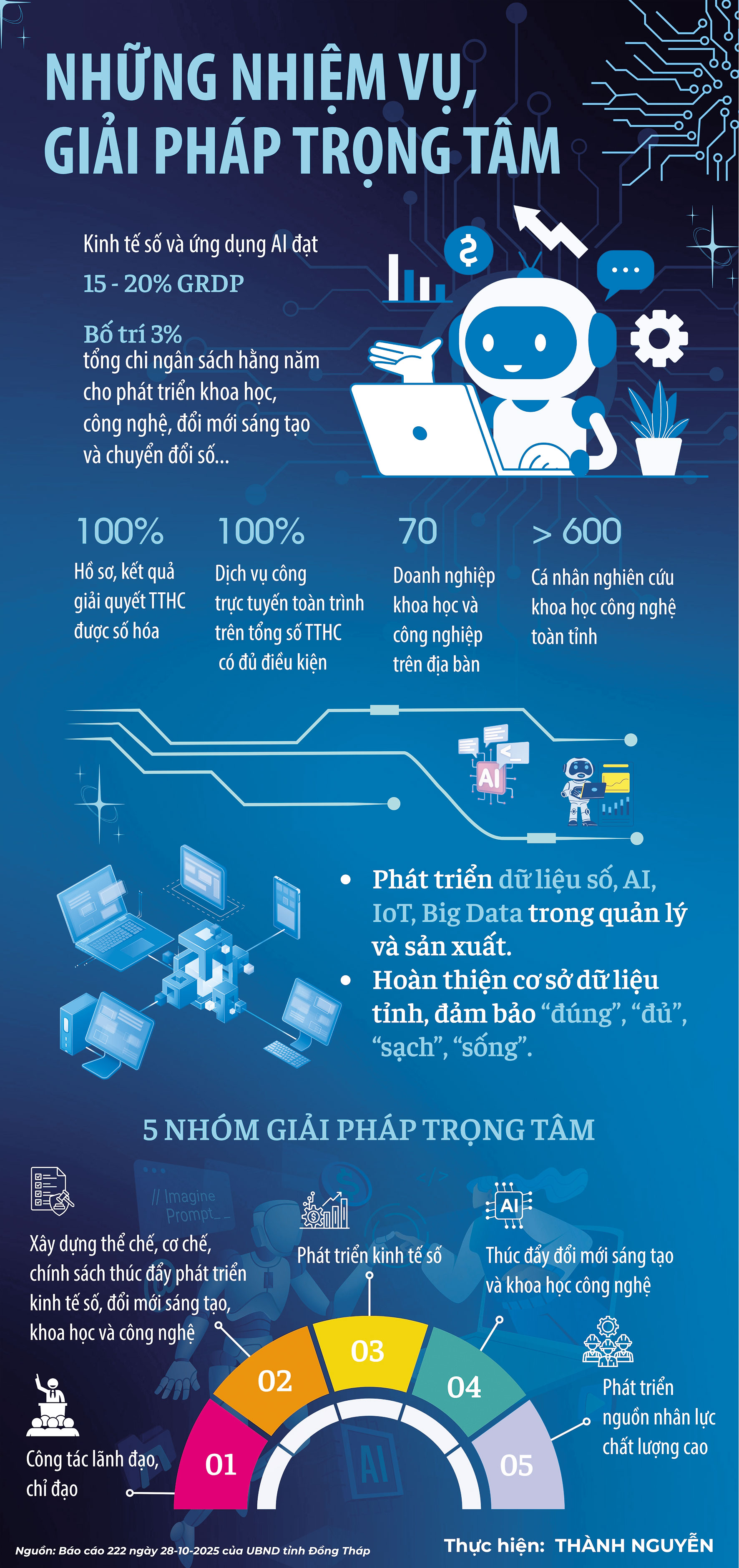 Ngoài ra, Đồng Tháp tính toán xây dựng và phát triển các nền tảng cung cấp các công nghệ số (loT, trí tuệ nhân tạo - AI, dữ liệu lớn, chuỗi khối, điện toán đám mây, an ninh mạng...), làm hạ tầng mềm phát triển kinh tế - xã hội; đẩy mạnh ứng dụng các công nghệ này (đặc biệt là AI, IoT, Big Data) trong quản lý môi trường và xây dựng đô thị thông minh nhằm nâng cao chất lượng sống người dân.
