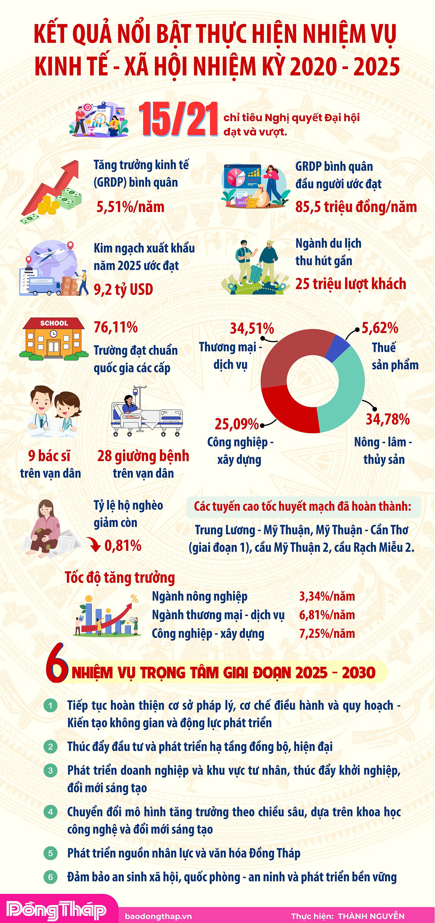 Song song đó, bên cạnh nhiệm vụ thúc đẩy đầu tư và phát triển hạ tầng đồng bộ, hiện đại; phát triển doanh nghiệp và khu vực tư nhân, thúc đẩy khởi nghiệp, đổi mới sáng tạo; phát triển nguồn nhân lực và văn hóa Đồng Tháp; đảm bảo an sinh xã hội, quốc phòng - an ninh và phát triển bền vững, theo đồng chí Trần Trí Quang, tỉnh cũng xác định chuyển đổi mô hình tăng trưởng theo chiều sâu, dựa trên khoa học công nghệ và đổi mới sáng tạo là một trong những nhiệm vụ trọng tâm.