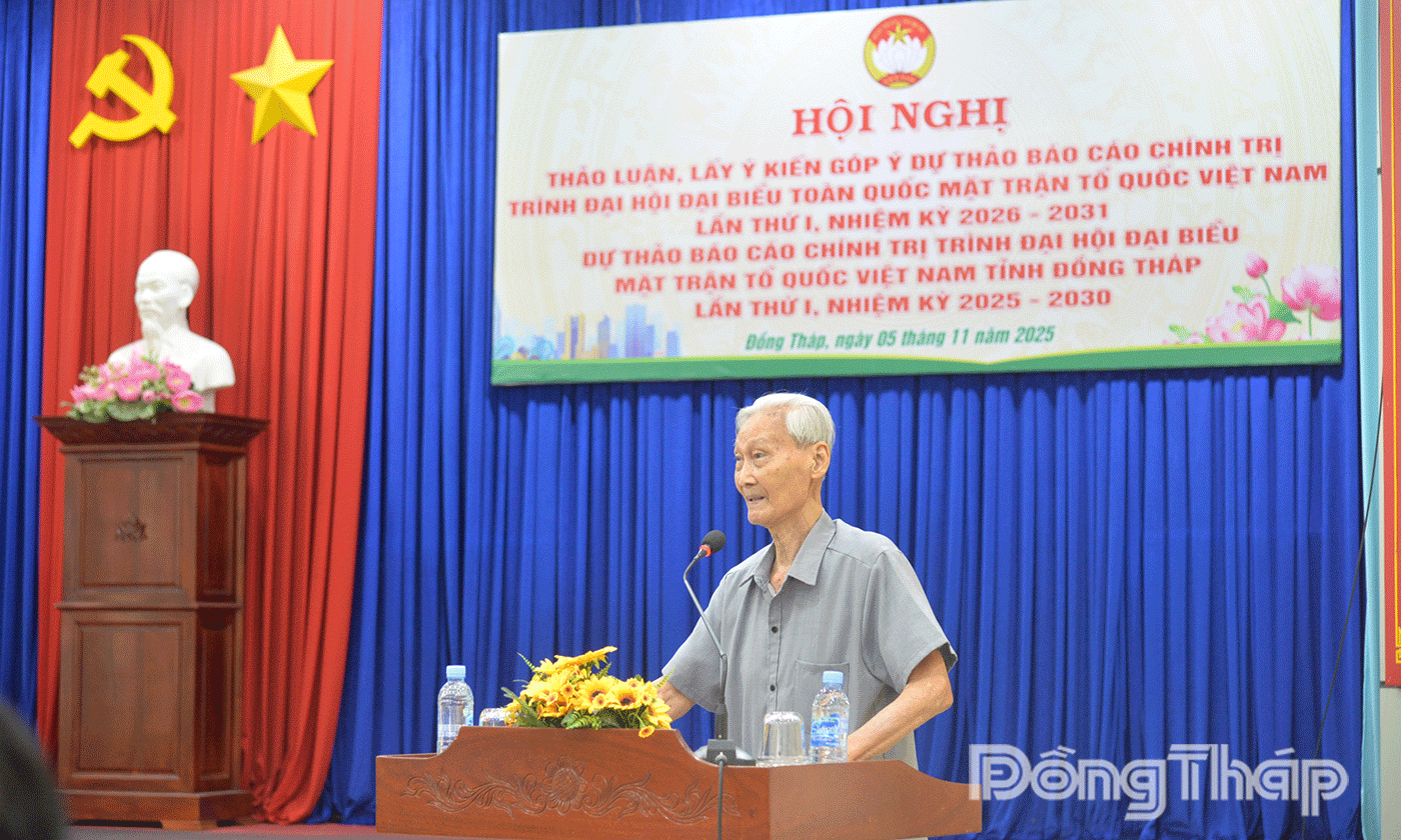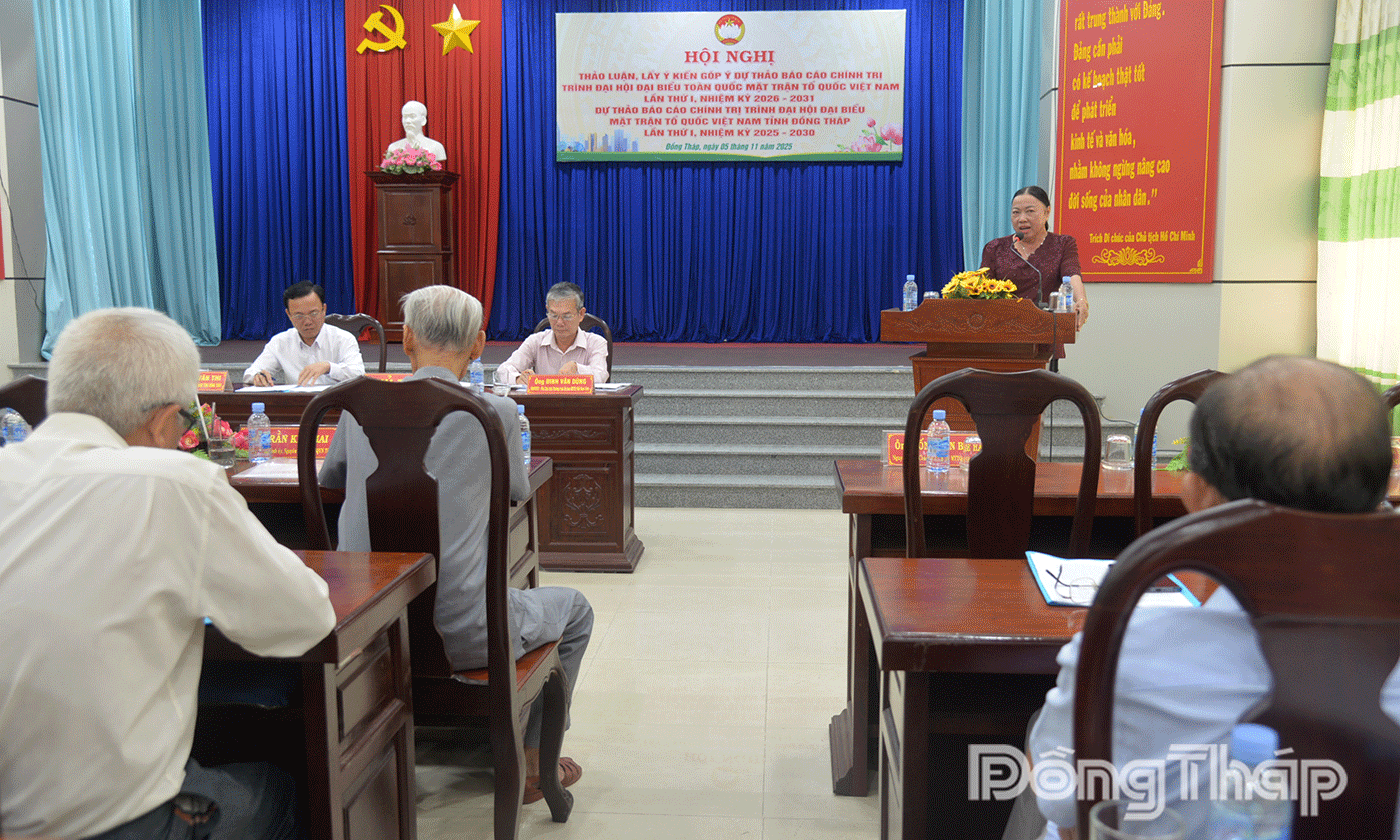 (ĐTO) Chiều ngày 5-11, Ban Thường trực Ủy ban Mặt trận Tổ quốc (MTTQ) Việt Nam tỉnh Đồng Tháp tổ chức Hội nghị thảo luận, lấy ý kiến đóng góp Dự thảo báo cáo Chính trị trình Đại hội đại biểu toàn quốc MTTQ Việt Nam lần thứ I, nhiệm kỳ 2026 - 2031 và Dự thảo báo cáo Chính trị trình Đại hội đại biểu MTTQ Việt Nam tỉnh Đồng Tháp lần thứ I, nhiệm kỳ 2025 - 2030.