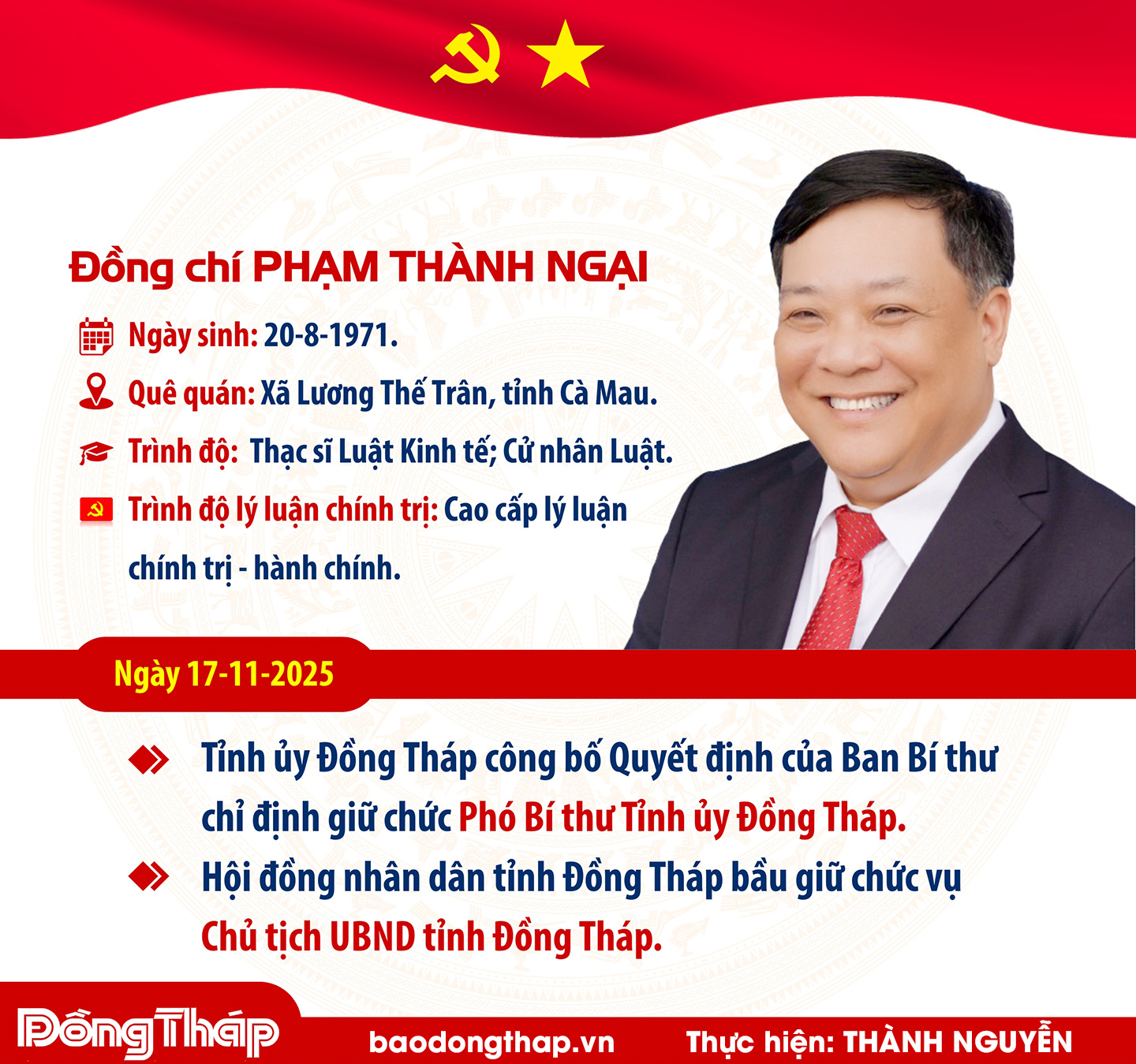 (ĐTO) Theo quyết định của Ban Bí thư, đồng chí Phạm Thành Ngại, Phó Bí thư Tỉnh ủy, Chủ tịch UBND tỉnh Cà Mau thôi tham gia Ban Chấp hành, Ban Thường vụ và thôi giữ chức Phó Bí thư Tỉnh ủy Cà Mau nhiệm kỳ 2025 - 2030; điều động, chỉ định tham gia Ban Chấp hành, Ban Thường vụ và giữ chức Phó Bí thư Tỉnh ủy Đồng Tháp nhiệm kỳ 2025 - 2030. Đồng chí Phạm Thành Ngại được giới thiệu để HĐND tỉnh bầu giữ chức vụ Chủ tịch UBND tỉnh Đồng Tháp.