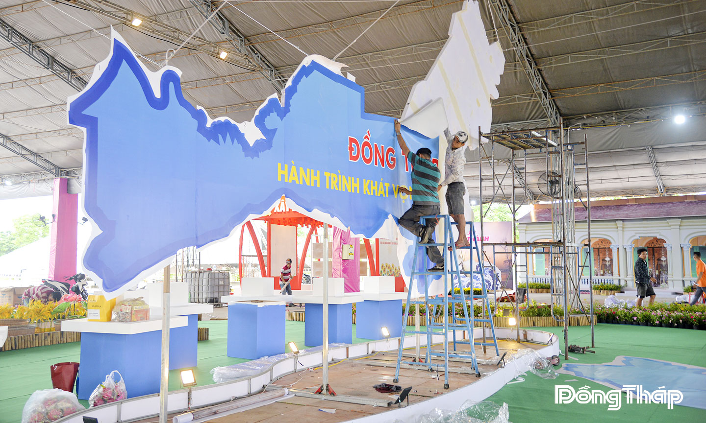 Đơn vị tổ chức đang khẩn trương hoàn thiện các hạng mục tại Triển lãm thành tựu kinh tế - xã hội với chủ đề “Đồng Tháp - Hành trình khát vọng”. Ảnh: VĂN THẢO |