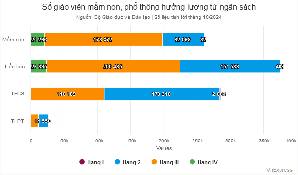 Cả nước có hơn 1,05 triệu nhà giáo đang hưởng lương từ ngân sách nhà nước, trong đó hơn 260.000 ở bậc mầm non. Theo đề xuất của Bộ, giáo viên mầm non nhận lương tối thiểu là 6,14 triệu đồng. Mức cao nhất là 18,66 triệu đồng một tháng với giáo viên mầm non hạng I, bậc 8, tăng 3,73 triệu đồng so với hiện nay, song nhóm này chỉ vài chục người trong cả nước. Mức tăng phổ biến là 1-2 triệu đồng. Ngoài tiền lương, họ hưởng một số khoản khác như phụ cấp thâm niên (1% mỗi năm làm việc, sau 5 năm), phụ cấp ưu đãi nghề (35-70%)...