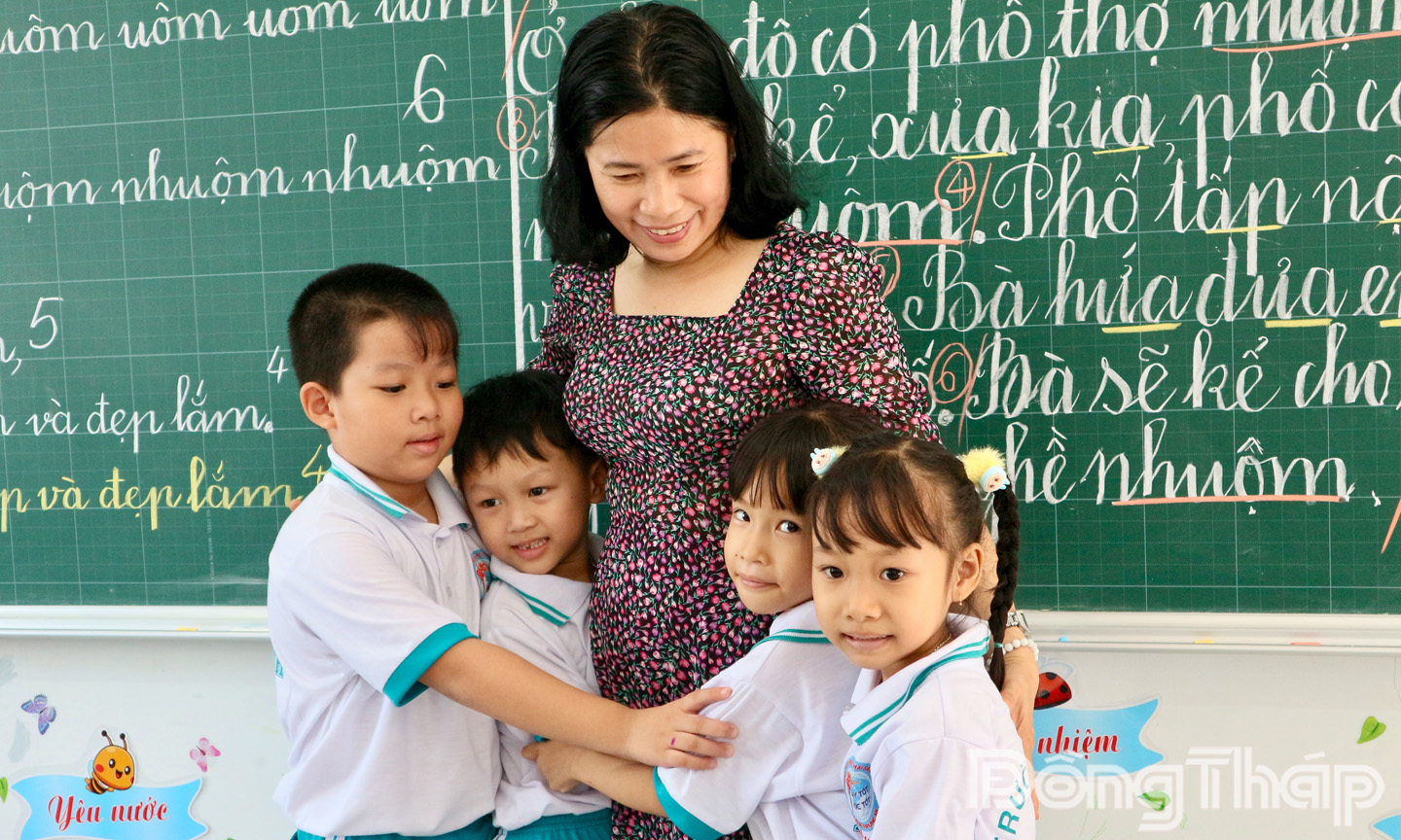 | Đối với học sinh tiểu học, ở trường, cô giáo chính là người mẹ thứ hai của mình (trong ảnh: Cô và trò Trường Tiểu học Thái Sanh Hạnh, phường Trung An). Ảnh: VĂN PHÚC |
