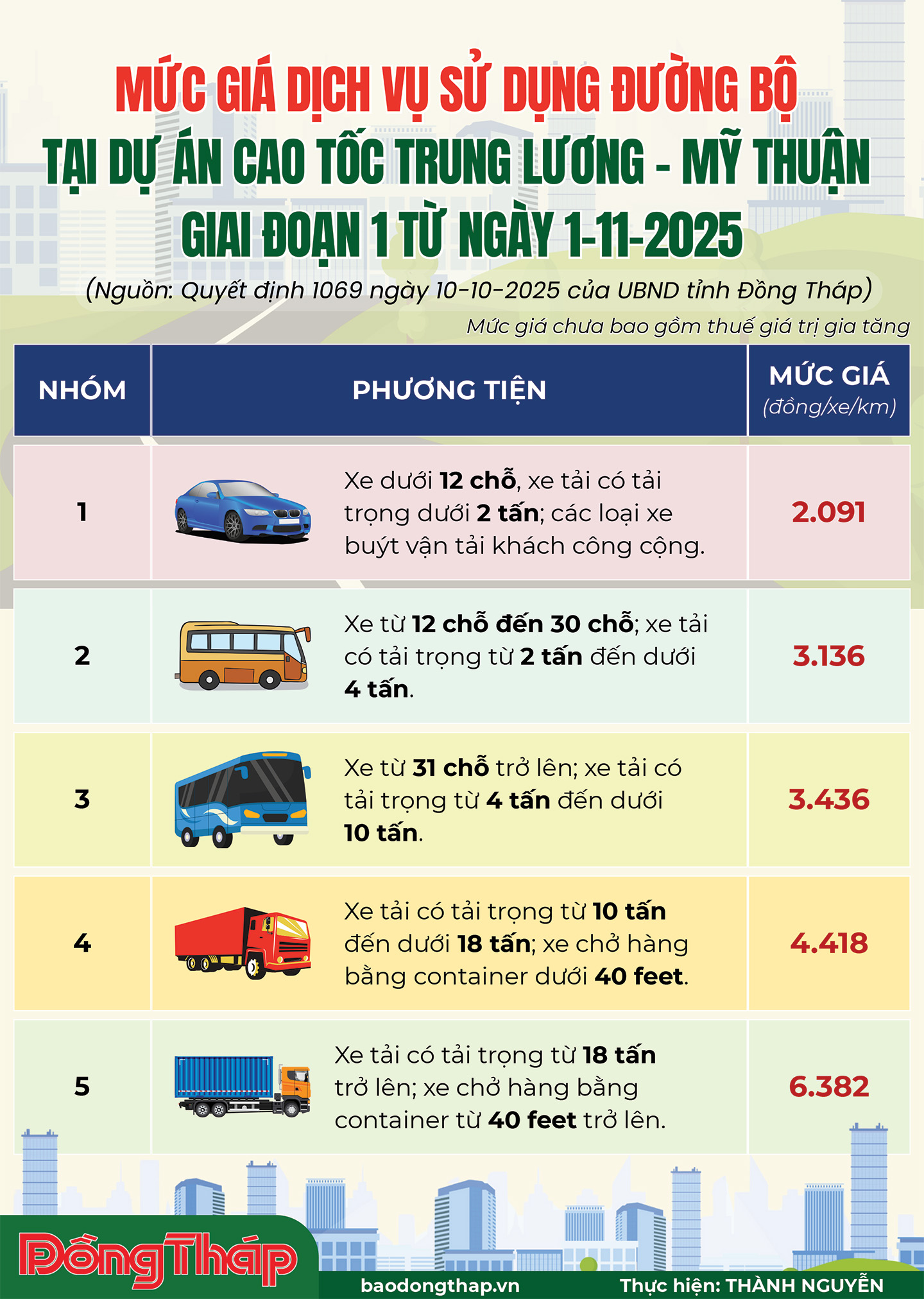 [Infographic] Mức giá dịch vụ sử dụng đường bộ tại Dự án Cao tốc Trung Lương - Mỹ Thuận giai đoạn 1 từ ngày 1-11-2025
