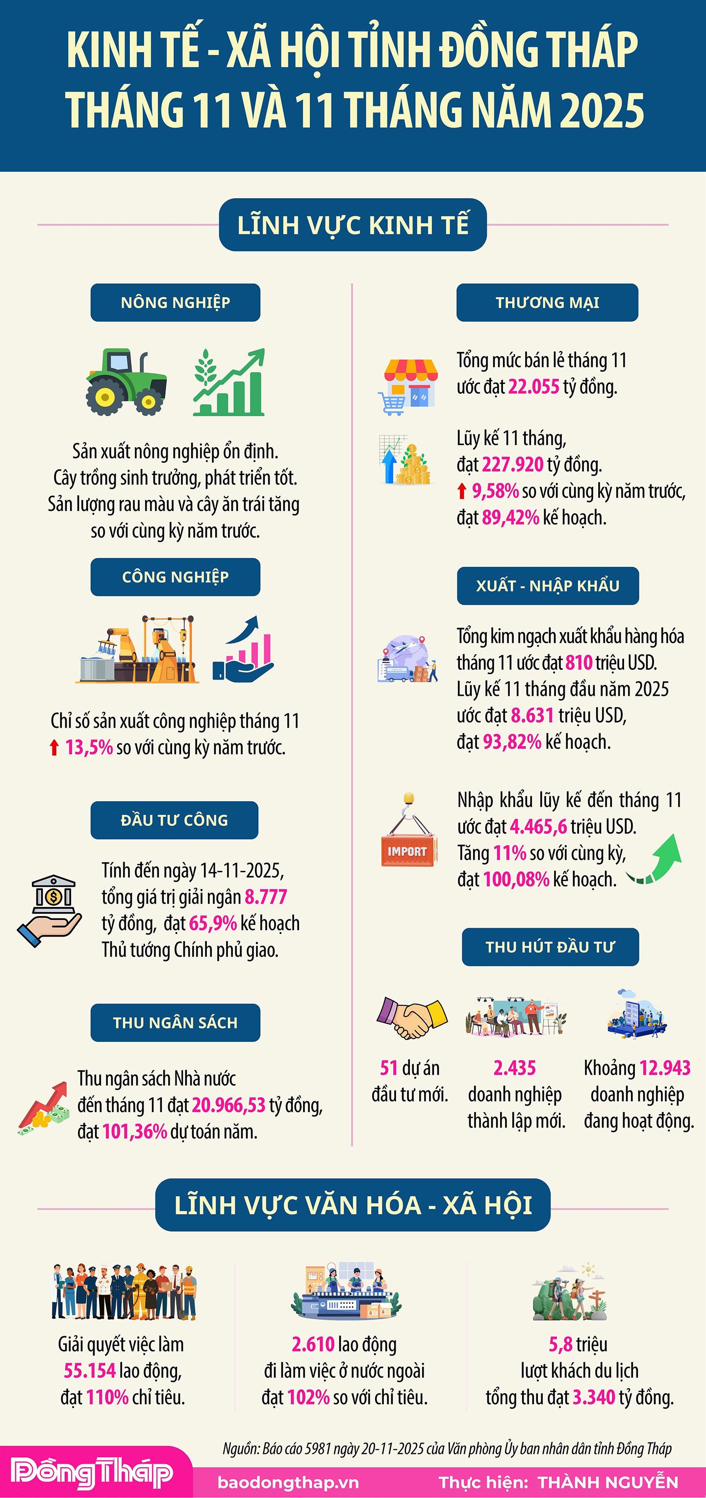 [Infographic] Kinh tế - xã hội tỉnh Đồng Tháp tháng 11 và 11 tháng năm 2025