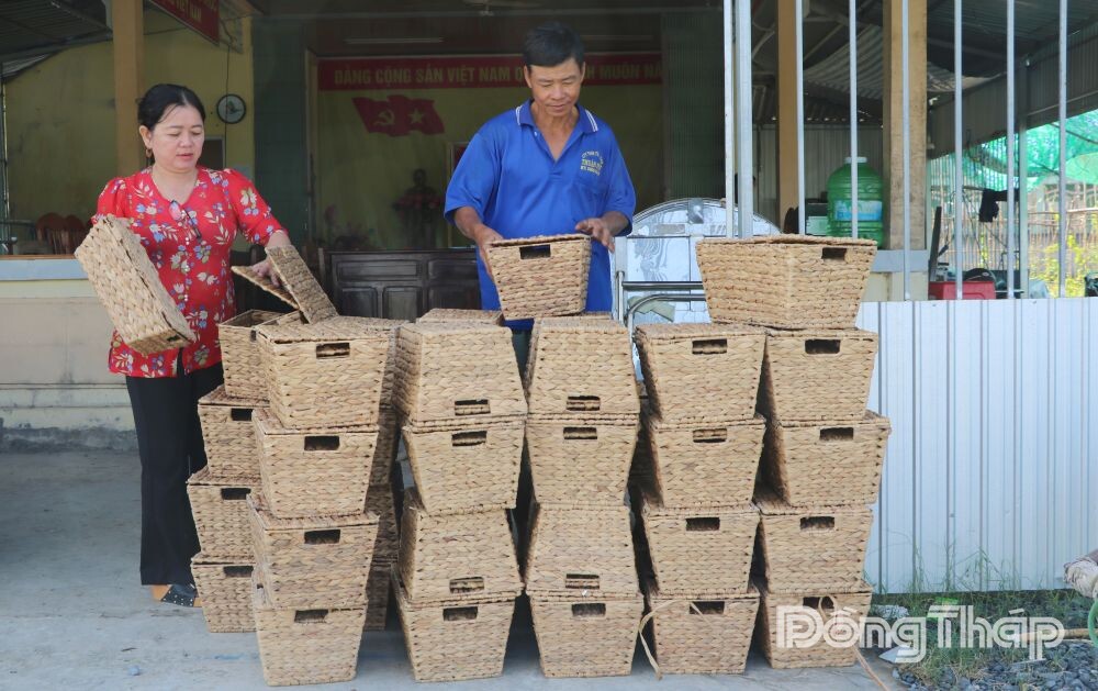 Hiện chị Bé Hai liên kết với cơ sở đan lục bình ở phường Cai Lậy để nhận khung, nguyên liệu lục bình phân phối cho chị em đan gia công các sản phẩm như khay đựng đồ, giỏ xách; còn đối với nghề may gia công, chị liên kết với cơ sở may quần áo ở phường Cao Lãnh, nhận đồ nam về cho chị em ráp gia công.