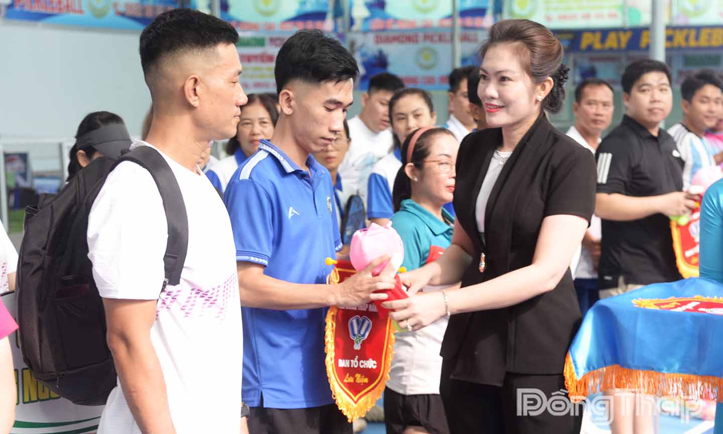 Lãnh đạo Sở Văn hóa - Thể thao và Du lịch tặng cờ luân lưu và cờ lưu niệm cho các đơn vị tham dự giải. |