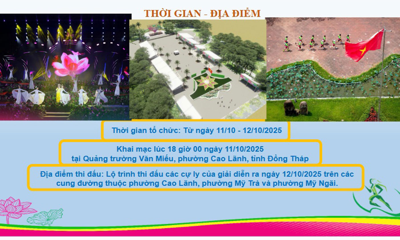 Thời gian tổ chức Giải Marathon Đất Sen hồng - Đồng Tháp năm 2025 từ ngày 10-10 đến 12-10-2025. Lễ khai mạc diễn ra vào lúc 19 giờ ngày 11-10-2025 tại Quảng trường Văn Miếu, phường Cao Lãnh, tỉnh Đồng Tháp. Lộ trình thi đấu các cự ly của giải diễn ra ngày 12-10-2025 trên các cung đường thuộc 3 phường: Cao Lãnh, Mỹ Trà và Mỹ Ngãi, tỉnh Đồng Tháp.