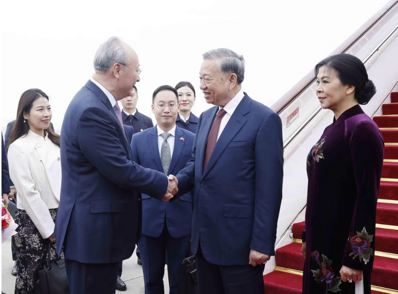 Đón Tổng Bí thư, Chủ tịch nước Tô Lâm và phu nhân tại sân bay, phía Trung Quốc có các đồng chí Doãn Lực, Ủy viên Bộ Chính trị, Bí thư Thành ủy Bắc Kinh; Lưu Hải Tinh, Ủy viên Trung ương Đảng, Trưởng Ban Liên lạc đối ngoại Trung ương, Đảng Cộng sản Trung Quốc; Hà Vĩ, Đại sứ Trung Quốc tại Việt Nam và phu nhân; Trần Châu, Phó trưởng Ban Liên lạc đối ngoại Trung ương, Đảng Cộng sản Trung Quốc.