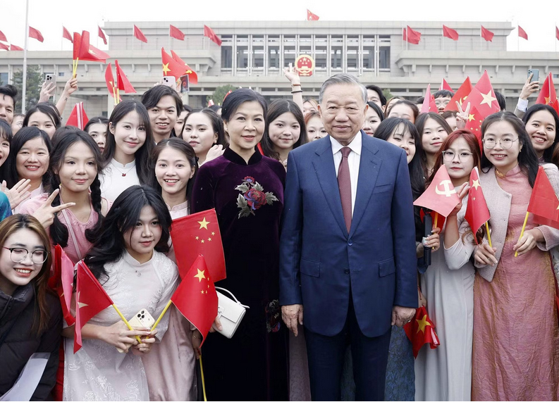Trong không khí vui tươi, Tổng Bí thư, Chủ tịch nước Tô Lâm và phu nhân vẫy chào đại diện kiều bào và sinh viên Việt Nam đang học tại Trung Quốc.