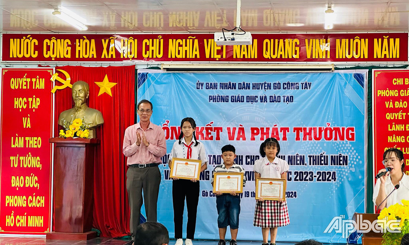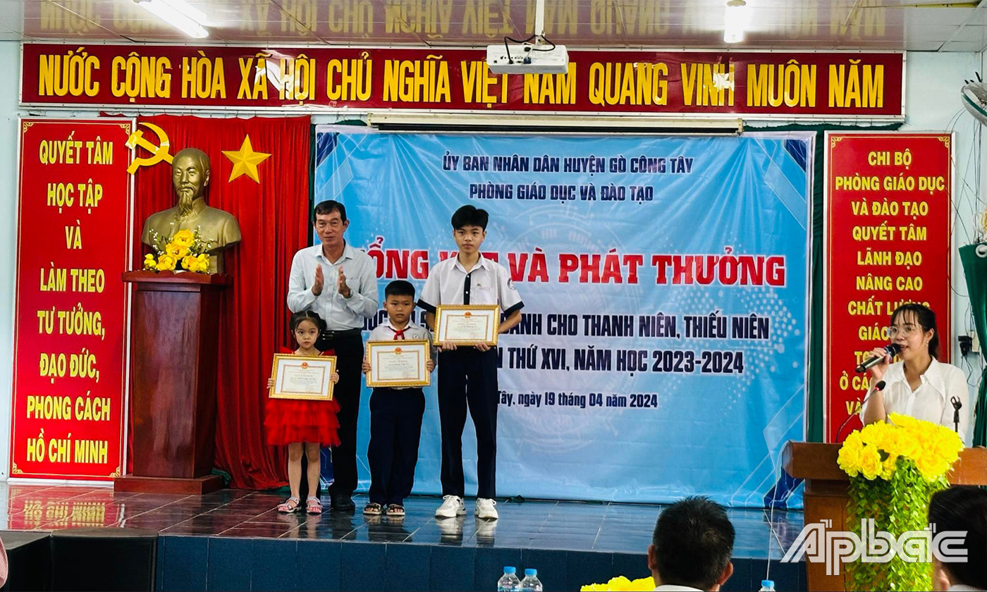 Tại hội nghị, UBND huyện Gò Công Tây đã trao 19 Giấy khen cho 19 cá nhân có thành tích xuất sắc trong Cuộc thi Sáng tạo dành cho thanh niên, thiếu niên và nhi đồng lần thứ XVI năm học 2023 - 2024.
