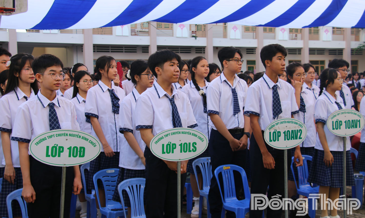 | Học sinh Trường Trung học phổ thông Chuyên Nguyễn Đình Chiểu trong buổi Lễ khai giảng năm học mới. |