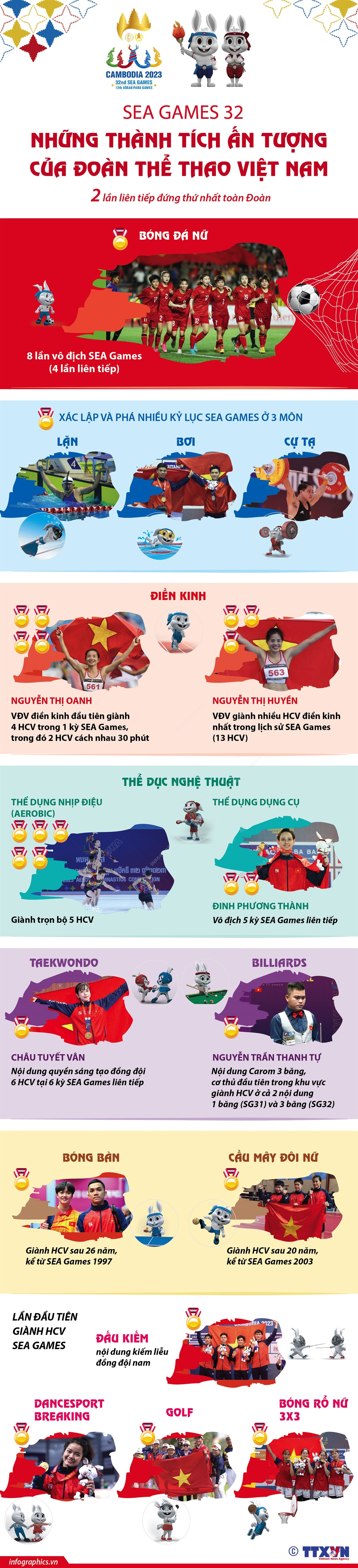 SEA Games 32 diễn ra từ ngày 26/4 đến ngày 18/5 gồm 36 môn thể thao với tổng số 581 nội dung. Sau 20 ngày thi đấu, Đoàn Thể thao Việt Nam đã hoàn thành xuất sắc nhiệm vụ được giao, giành được tổng cộng 359 huy chương các loại, trong đó 136 huy chương vàng, 105 huy chương bạc, 118 huy chương đồng, phá 12 kỷ lục và thiết lập 4 kỷ lục SEA Games. Đặc biệt đây là lần đầu tiên Thể thao Việt Nam dẫn đầu toàn đoàn tại một kỳ Đại hội thể thao lớn nhất khu vực khi thi đấu ở nước ngoài.