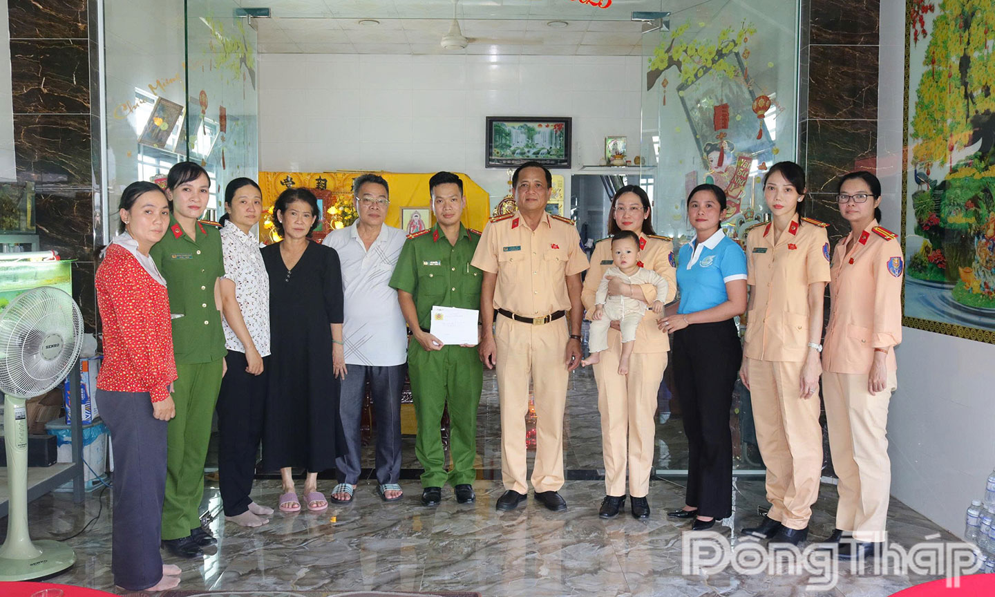 (ĐTO) Ngày 15-10, Phòng Cảnh sát giao thông (CSGT) - Công an tỉnh Đồng Tháp tổ chức buổi thăm hỏi, sẻ chia với gia đình cháu Lê Tiên (sinh năm 2024), là con gái của đồng chí Nguyễn Thị Diệu Hiền, nguyên cán bộ Công an xã Bình Thành, không may tử vong do tai nạn giao thông.