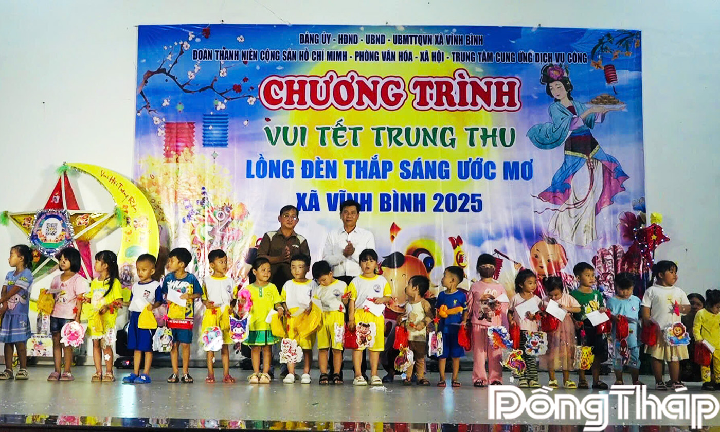 (ĐTO) Với mong muốn đem đến một mùa Trung thu ấm áp yêu thương, nhiều nụ cười và ngập tràn tình cảm đến với các em thiếu nhi, tối 1-10, Đảng ủy, HĐND, UBND, Ủy ban Mặt trận Tổ quốc Việt Nam xã Vĩnh Bình, tỉnh Đồng Tháp tổ chức Chương trình “Vui Tết Trung thu - Lồng đèn thắp sáng ước mơ” năm 2025 trao tặng quà cho các em thiếu nhi có hoàn cảnh khó khăn trên địa bàn xã.